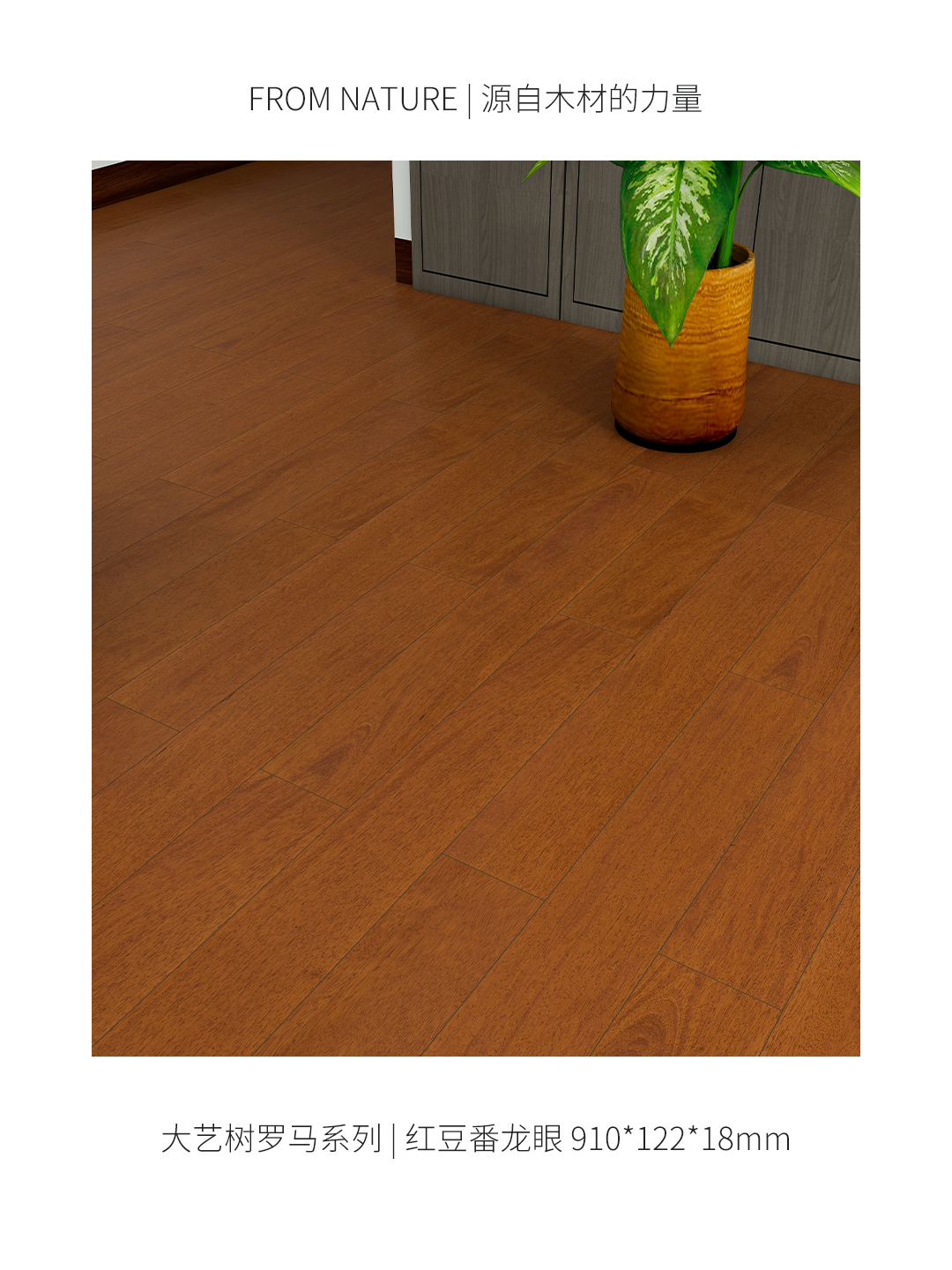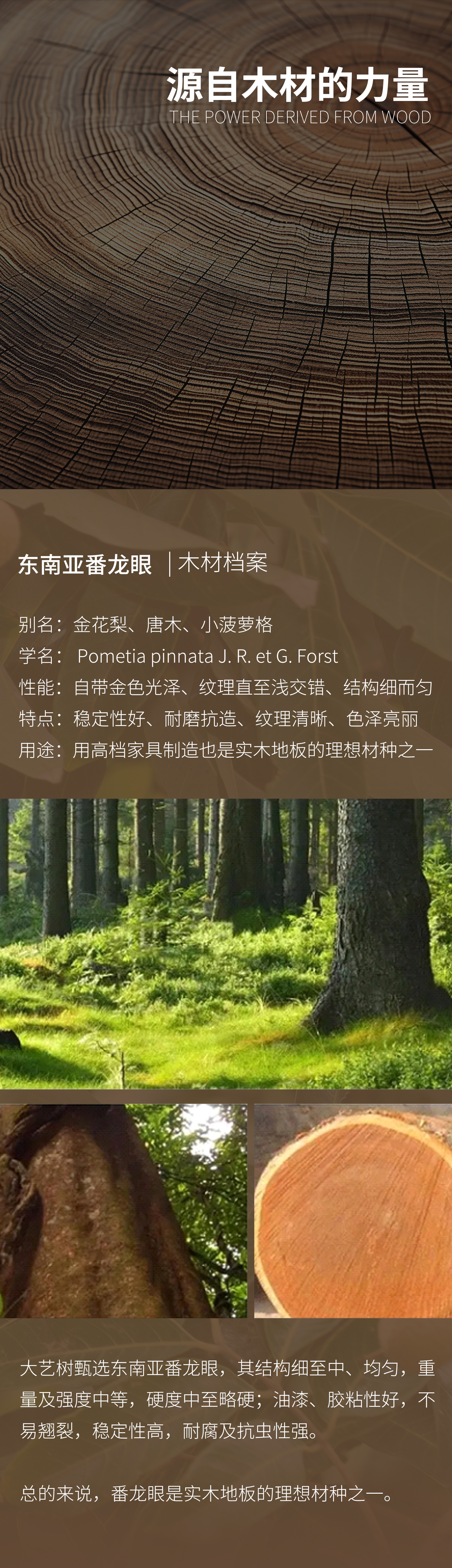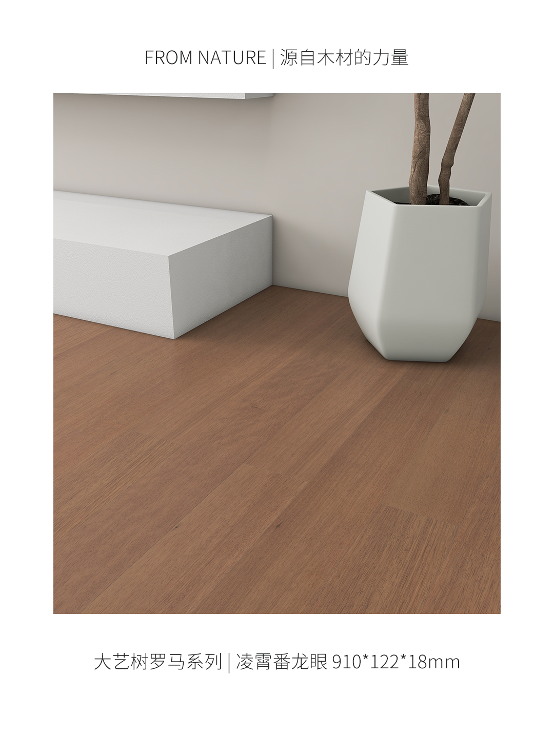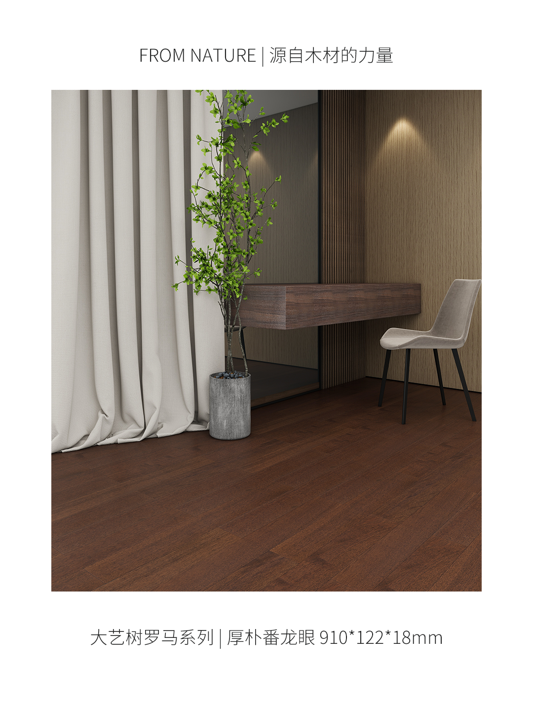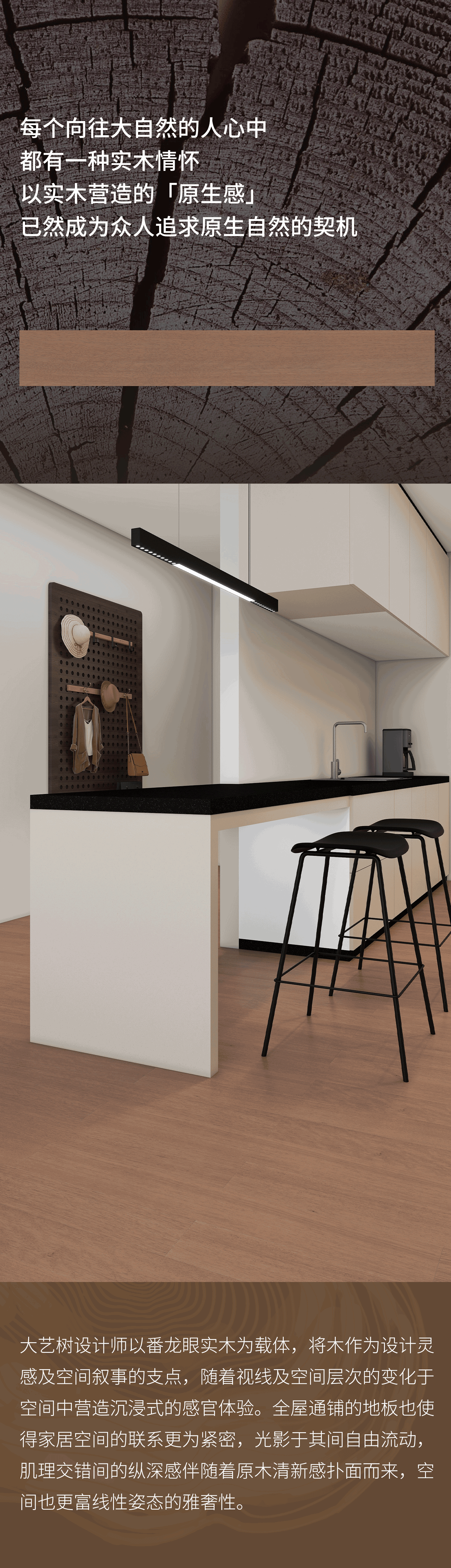 空间之中,每一片地板上,都能或隐或现地感受到木材本身的力量,时间将树皮表面的粗糙逐渐抚平,形成年轮,延伸进树芯,成为一棵树独一无二的标志,就是在这纯粹的原生之美里,地板外现雅奢,内秀自然。