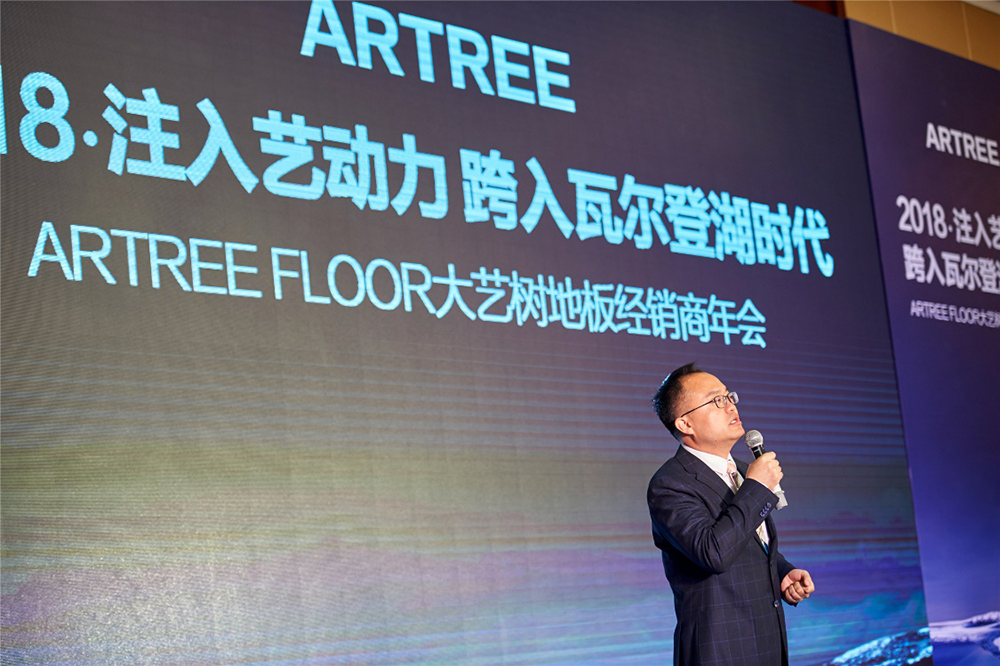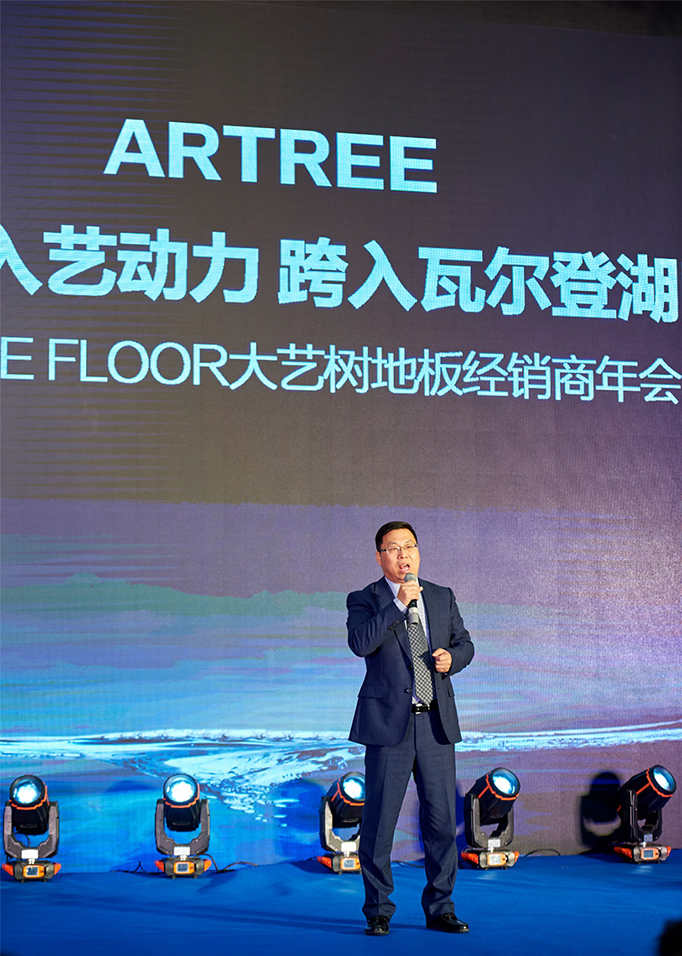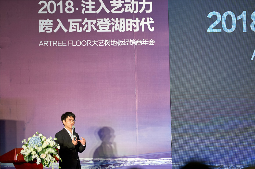 大艺树地板市场部经理滕井号先生也在大会上作了年度品牌报告,并进行了全新的品牌战略规划的宣讲。他指出,目前大艺树已凭借国际化的定位在市场中脱颖而出,接下来大艺树也将坚持这个大方向不变,并同时提炼出“艺术”为品牌文化的关键内核。
