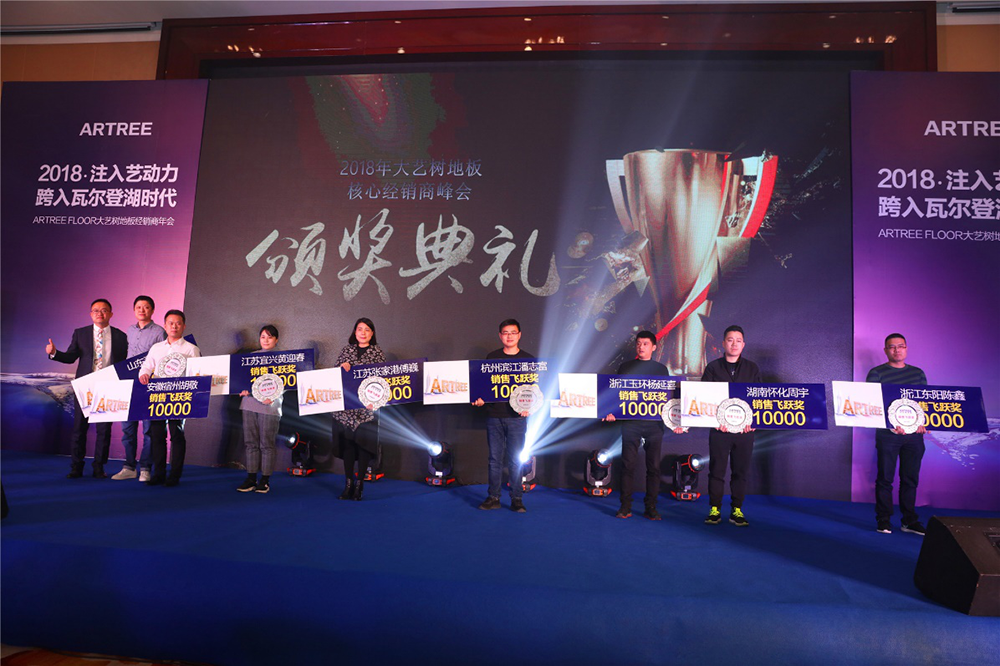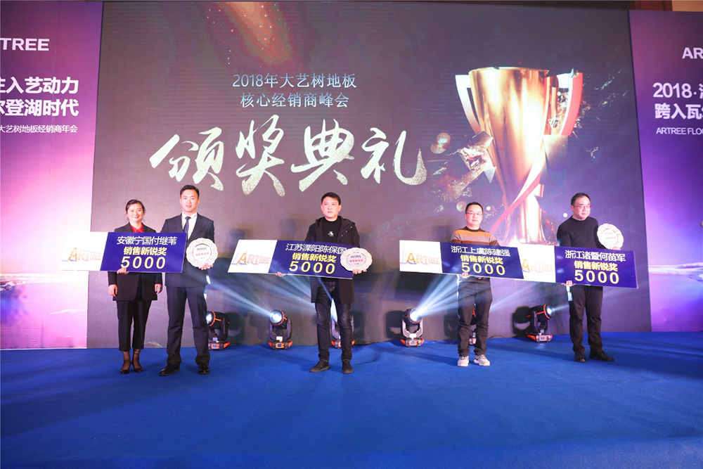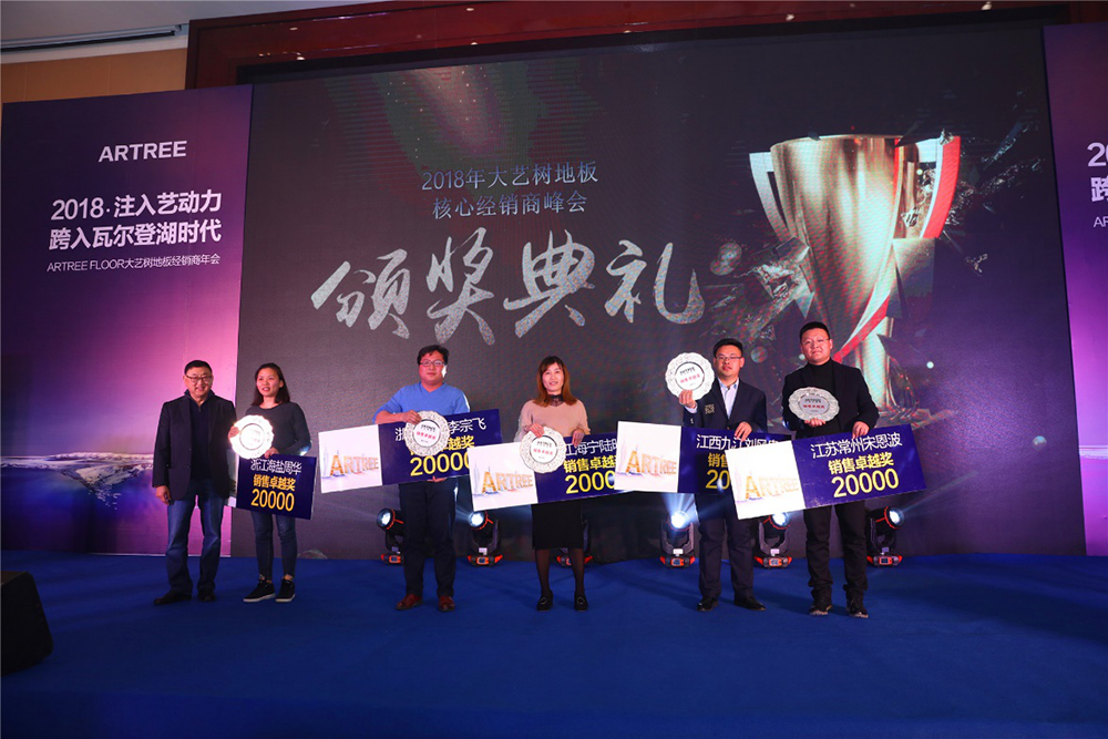 大艺树地板总经理刘振江先生、副总经理/销售总监杨大蔚先生、浙江良友木业副总经理葛晓海先生、ARTREE亚特兰大CEO David YAN等领导作为颁奖嘉宾,分别颁发了“销售冠军奖”、“销售亚军奖”、“销售卓越奖”、“杰出管理奖”、“销售飞跃奖”、“销售新锐奖”。