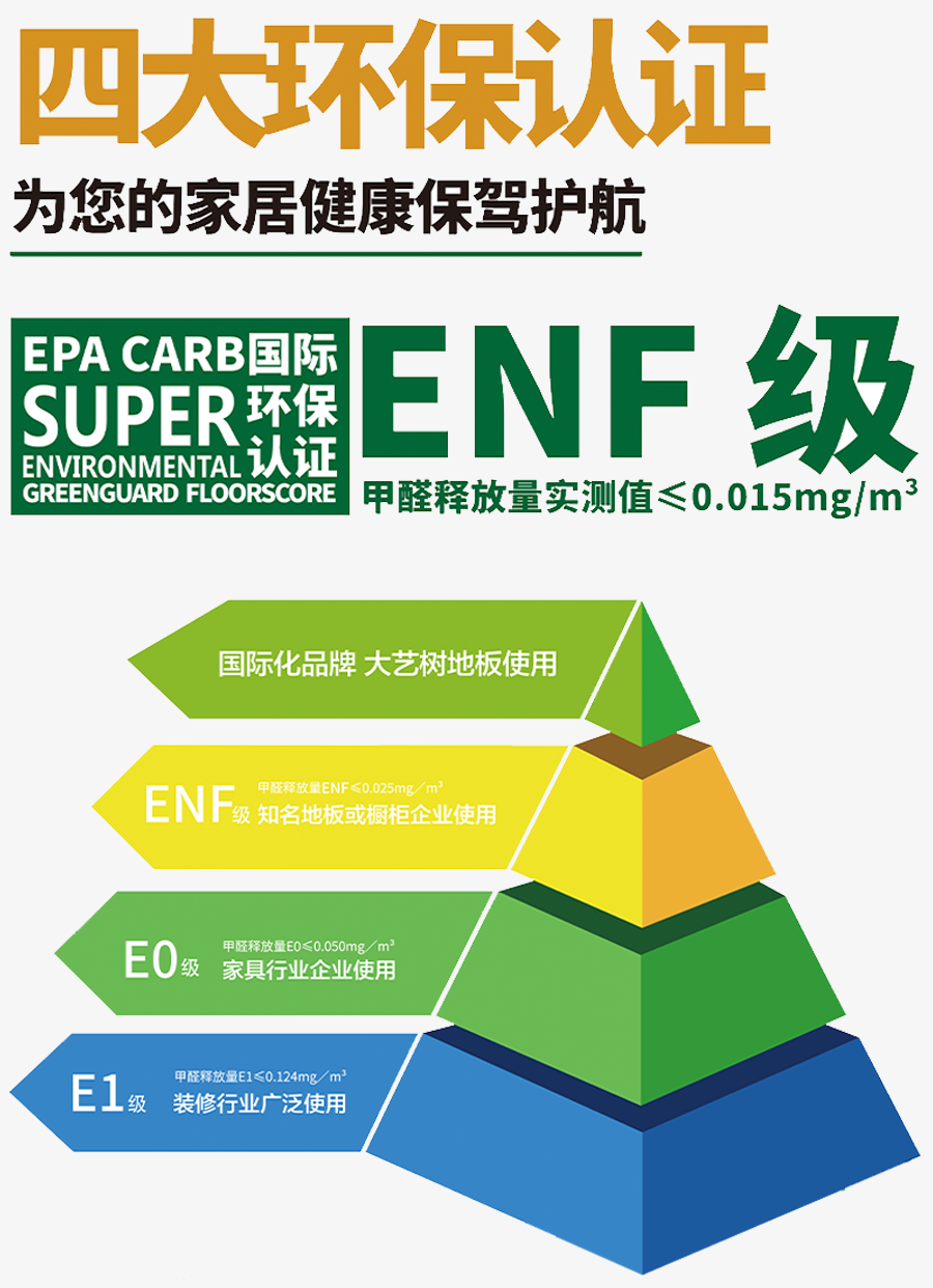 在ENF出来之前,大艺树地板就以品质为基,走在绿色环保制造的前列,早就有四大环保认证加持:FLOORSCORE认证、GREENGUARD认证、CARE II认证、EPA认证,还获得了腾讯家居|贝壳地板频道颁发的“年度环保先锋”奖。