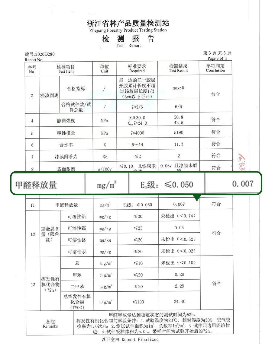 大艺树地板最新检测报告显示,甲醛释放量数据优于新国标ENF(≤0.025mg/m³)指标,成为第一批达到ENF等级的地板品牌。