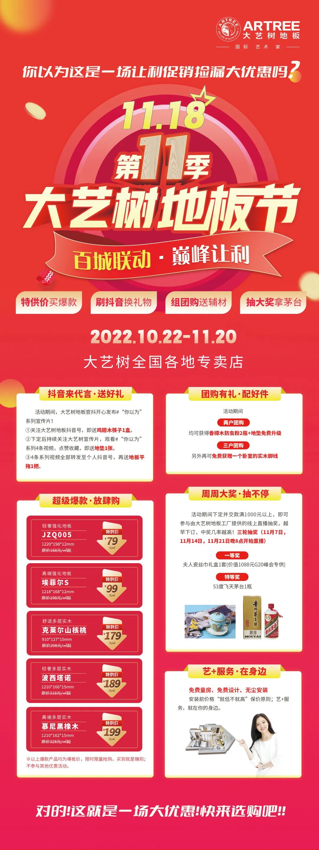 大艺树地板发起全民地板节活动,已经持续11年。这一次,我们站在全新的起点,用优质产品、优质服务,并与多家媒体平台共同打造你的“艺术之家”,让大艺树地板走进你的新家,为家在秋天增添一抹充满活力的暖色!