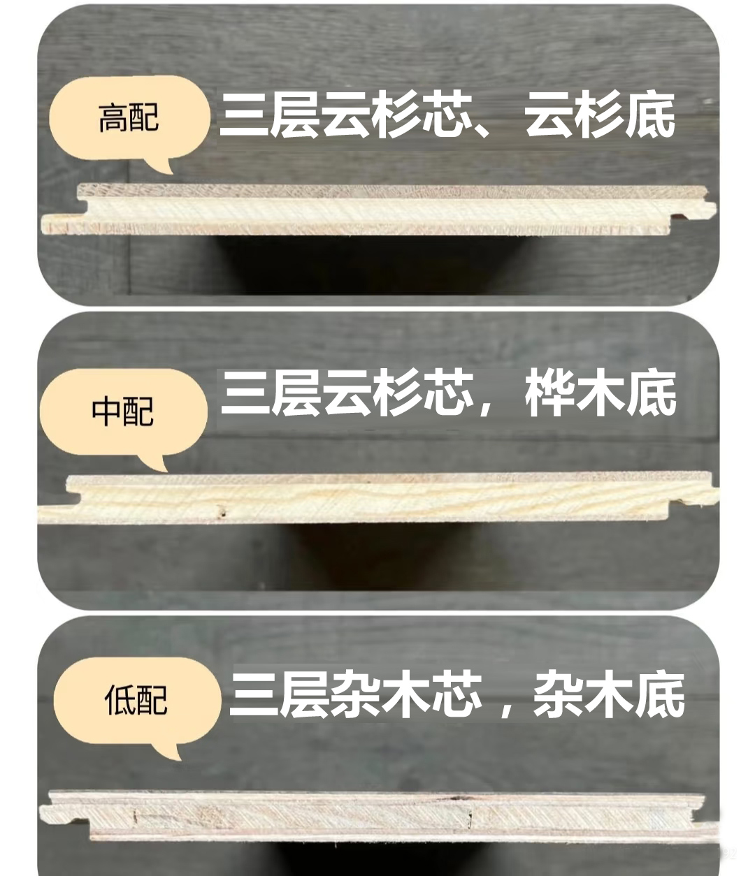 一种是工厂为了节省成本,选择使用一些杂木或松木的基材;第二种是云杉芯+桦木底,背板很干净,像在福尔马林里泡过一样;还有一种是高品质的三层实木地板会使用的纯云杉基材。
