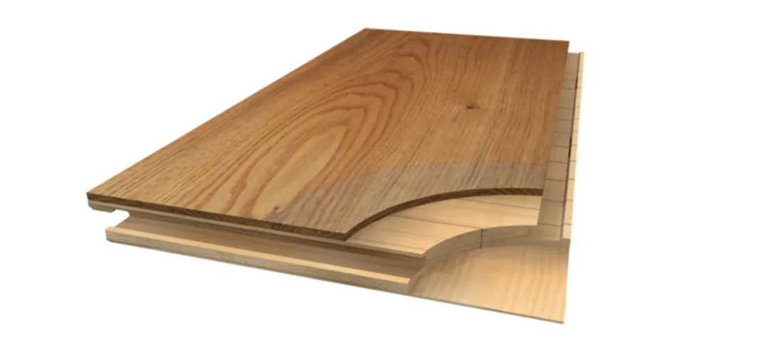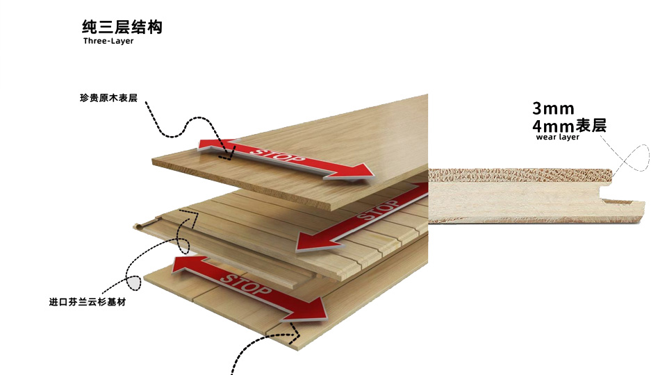 三层实木复合地板的表层单板与芯板、背板是纵横交错排列的,压贴后这三层结构内应力互相牵制,使木材应力变化的不均匀性受到限制。
