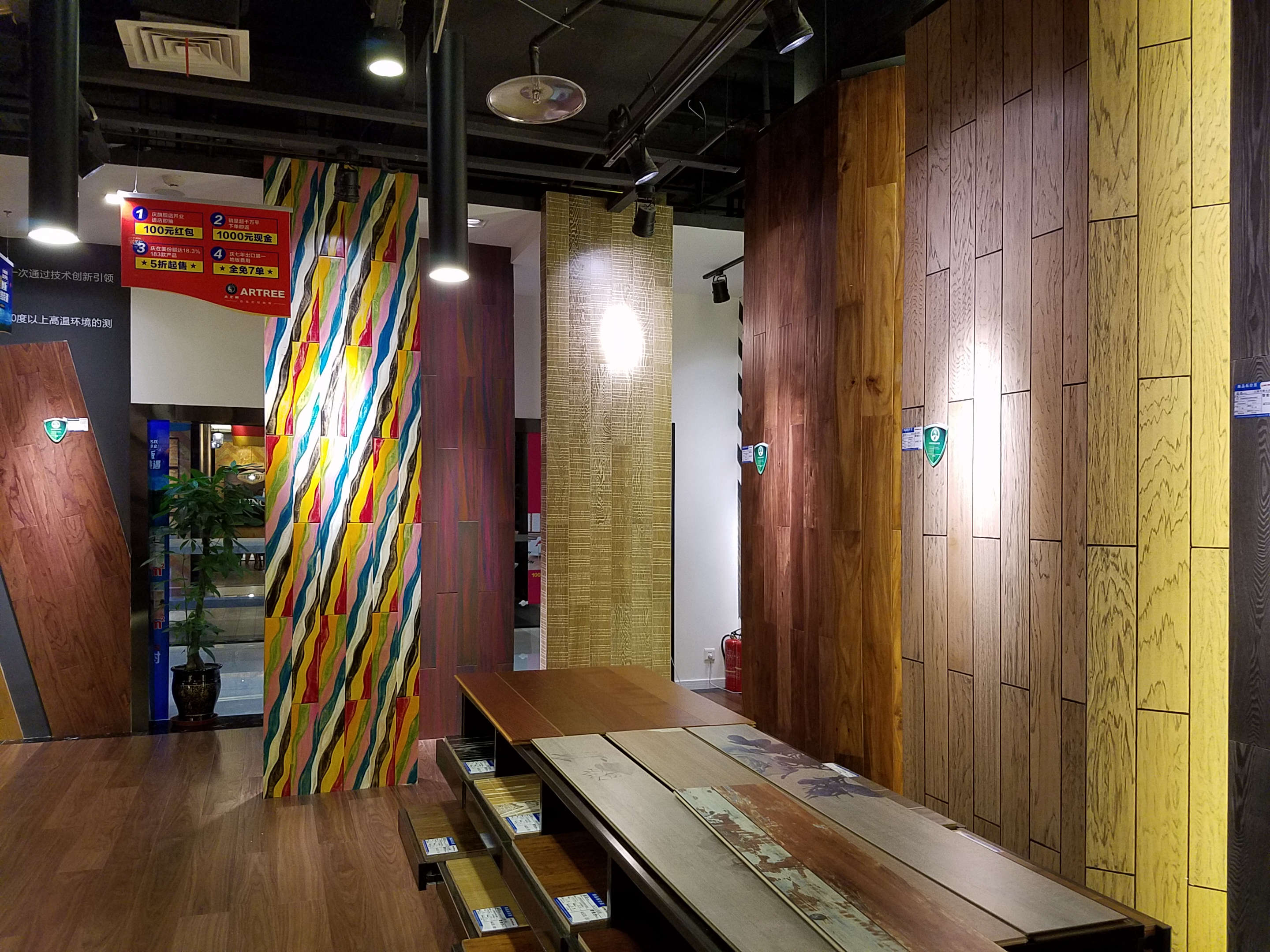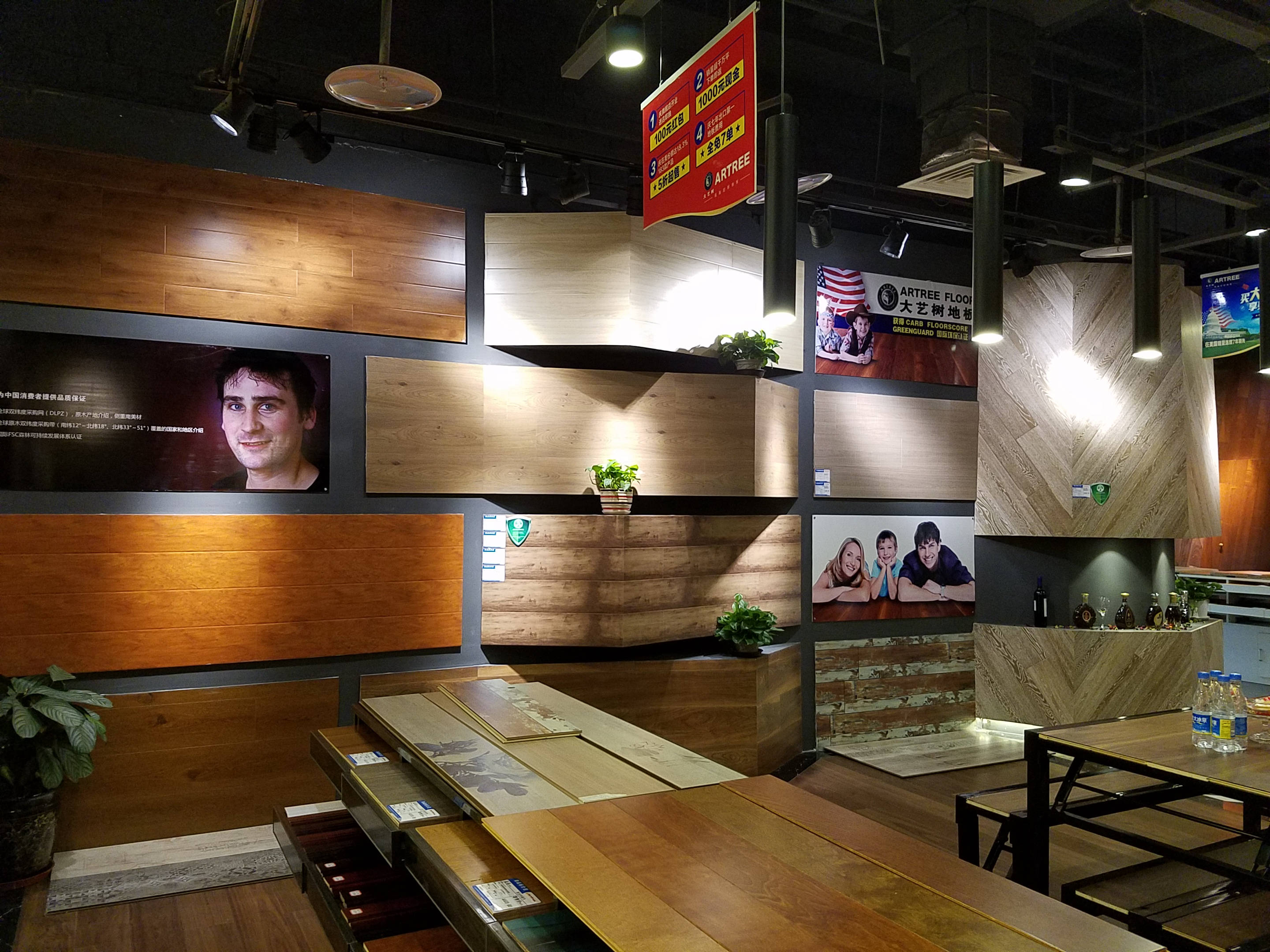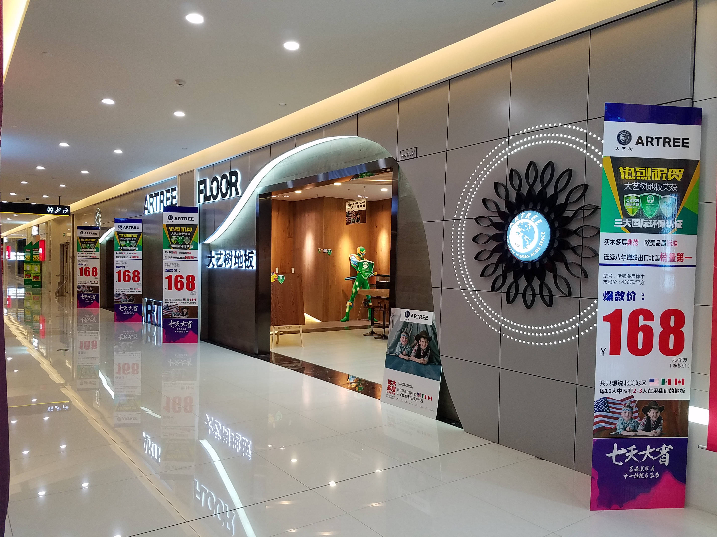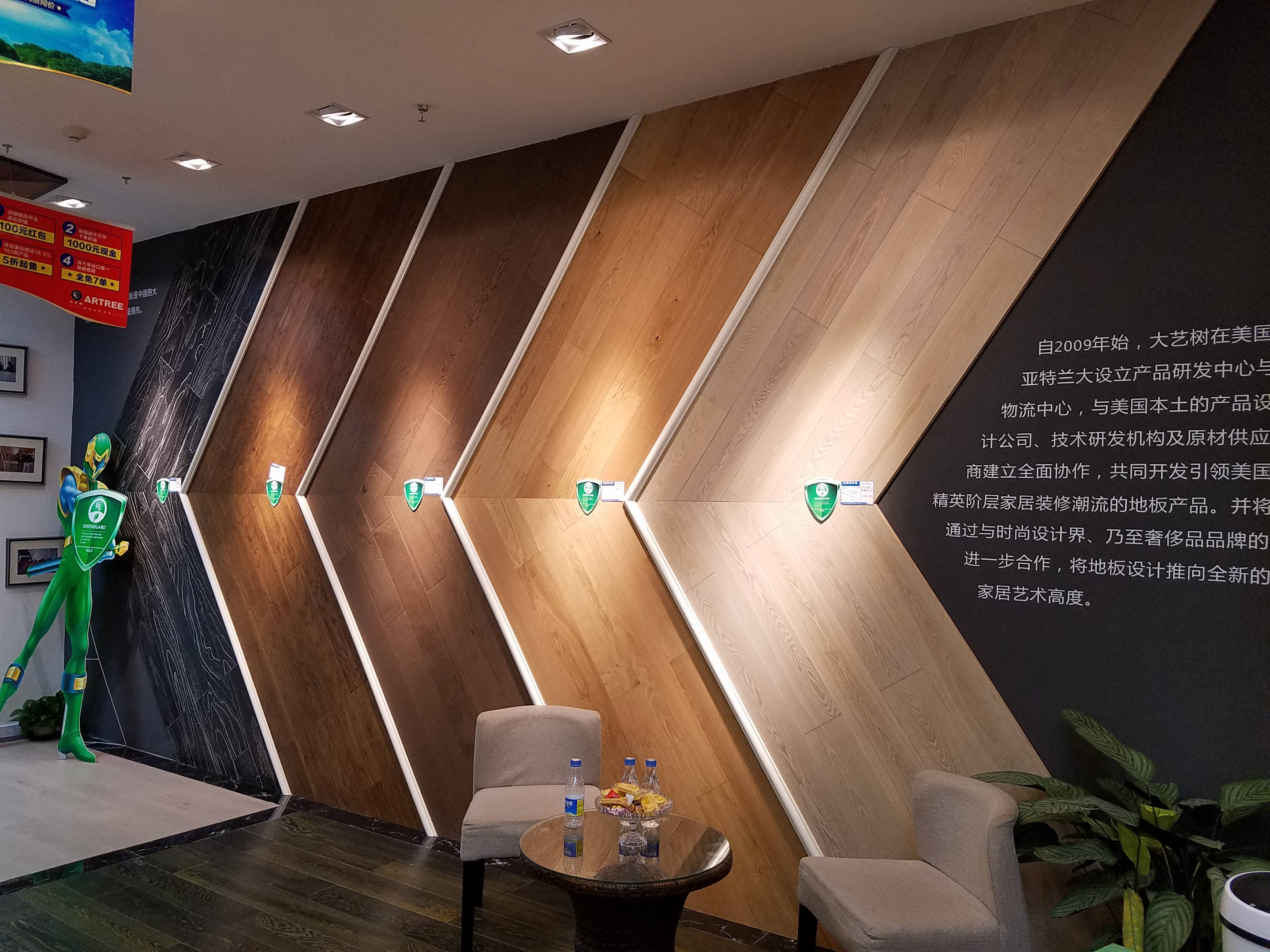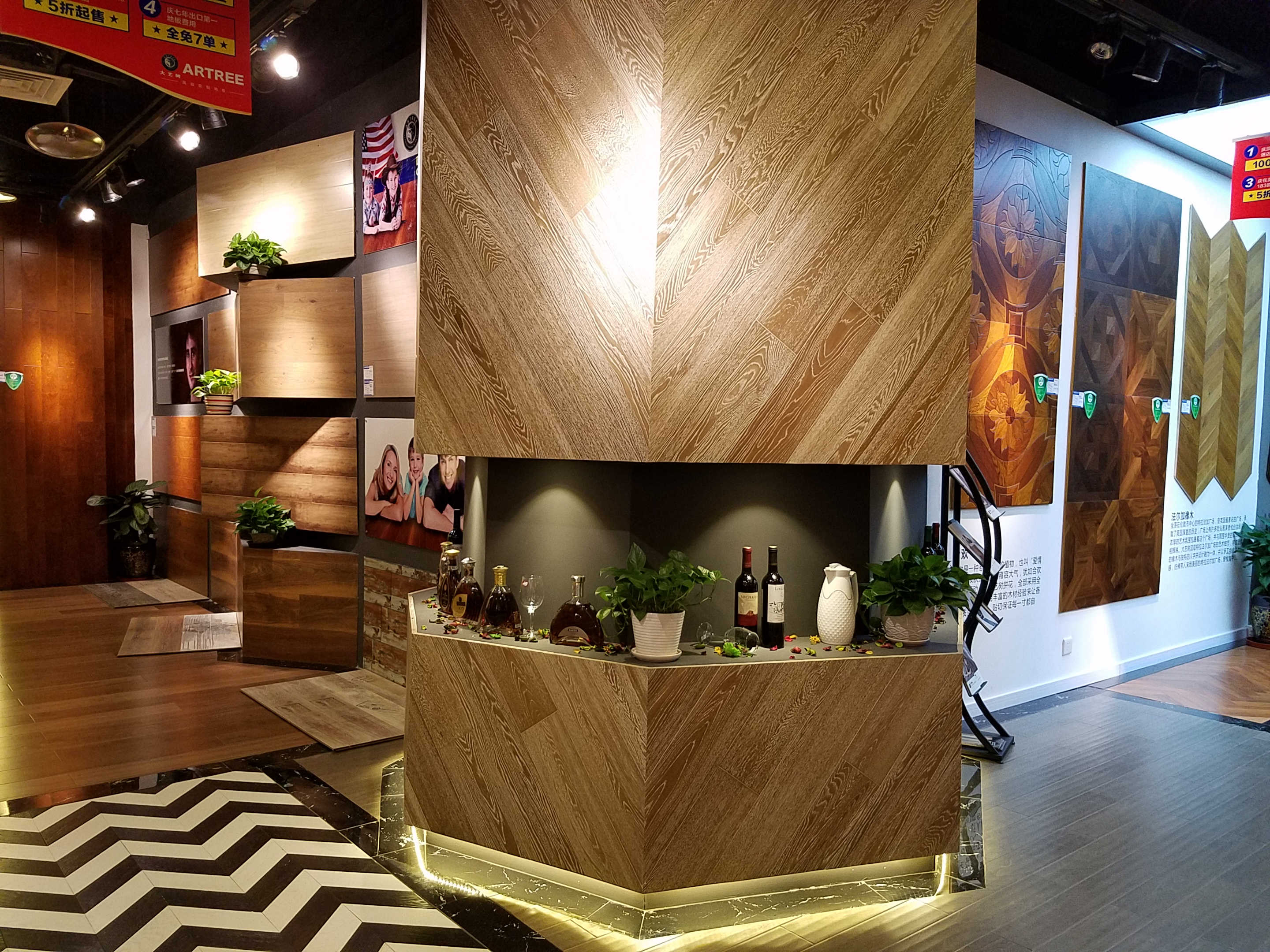门店展示陈列的产品涵盖大艺树全系列。从地面、到墙面、再到天花板,"上天入地"的创意陈列方式,配合自然而大气的地板产品,全方位呈现国际品牌的强大实力,生动的传递了自然主义的设计理念。