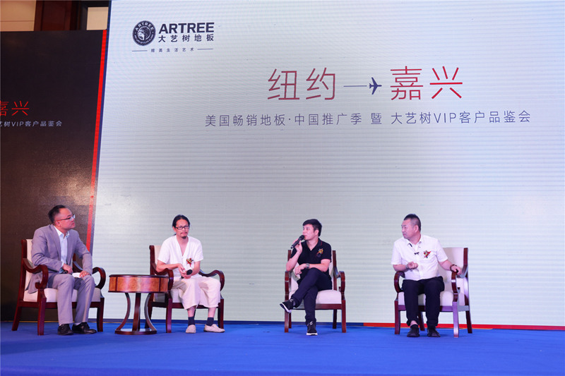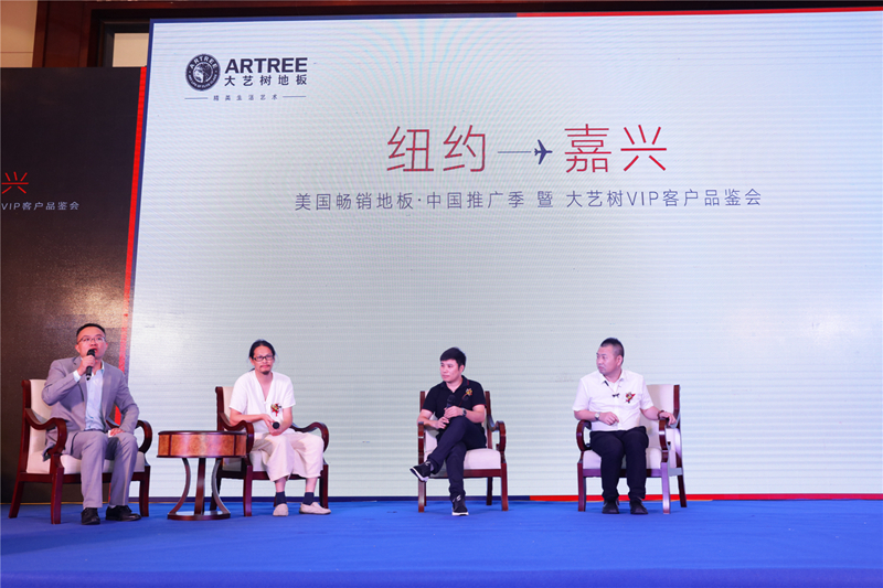 签约仪式后,现场举办了一场精彩的嘉宾论坛。大艺树邀请到了嘉兴市家居装饰装修协会秘书长陆明强先生、嘉兴星艺装饰总经理周雪辉先生、嘉兴红星美凯龙商场总经理吴向标先生,共同上台就大艺树地板的产品风格、及当下的家装趋势进行了深入的交流。