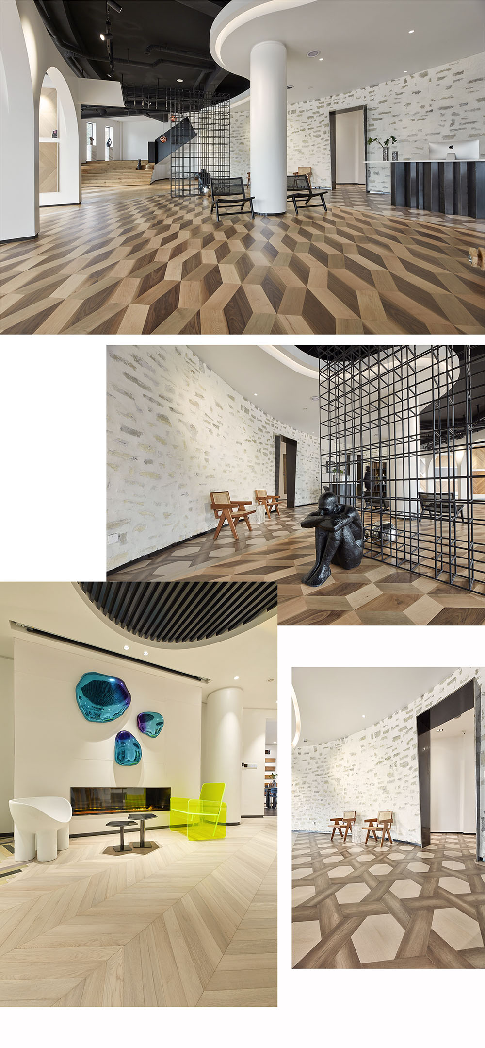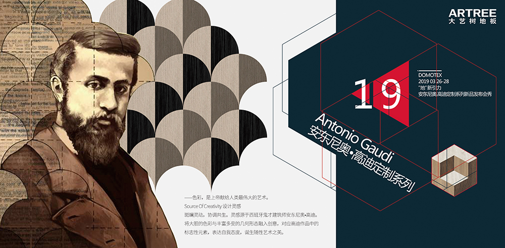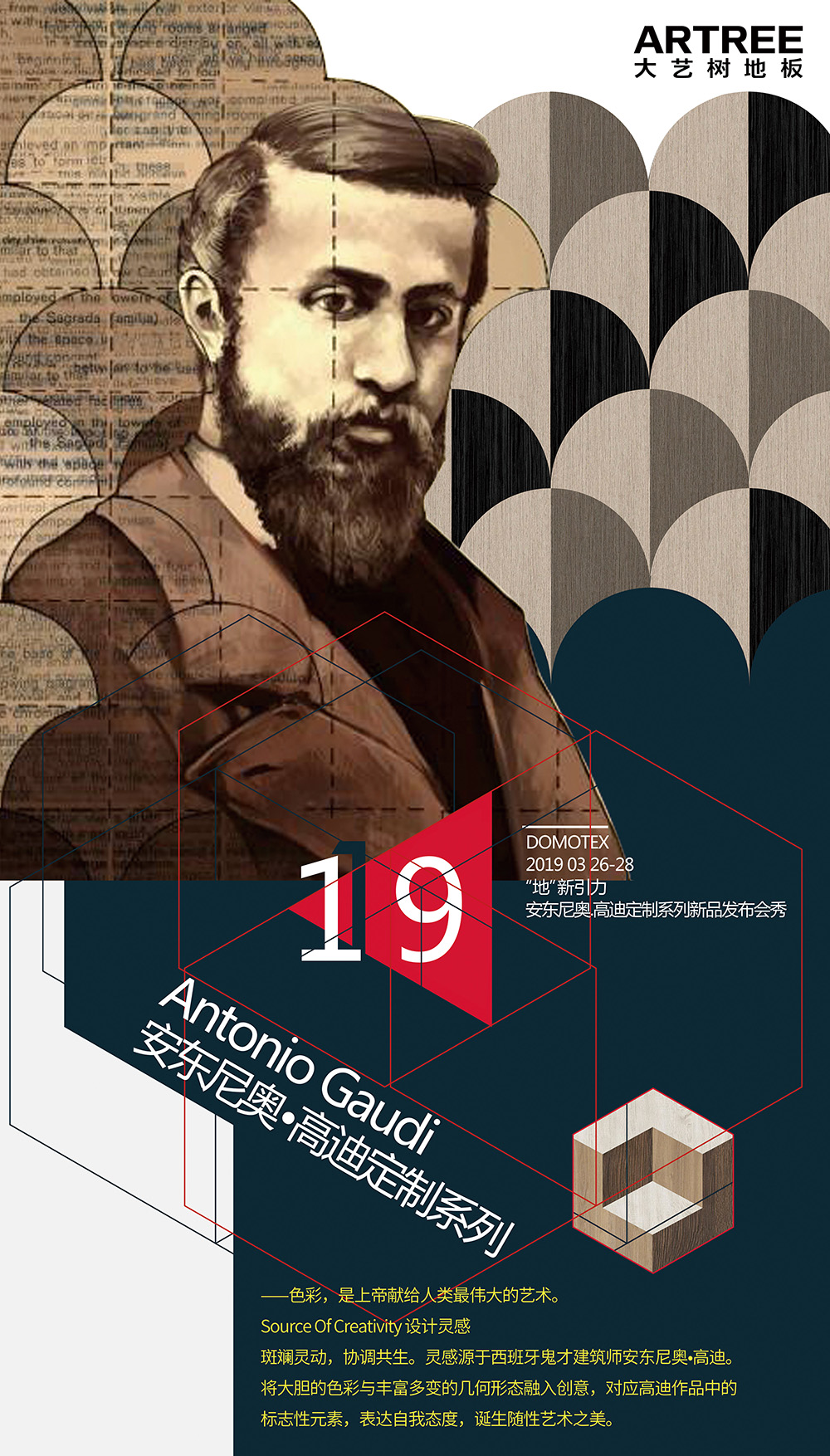 大艺树地板创意总监,国际著名设计师葛晓彪,由高迪的建筑作品中汲取灵感,打破固化规则,对传统地板发起创意挑战。温润细腻的木材,通过与斑斓色彩、灵动几何、以及现代主义元素的融合,诞生了独具艺术风格的"高迪定制系列"。