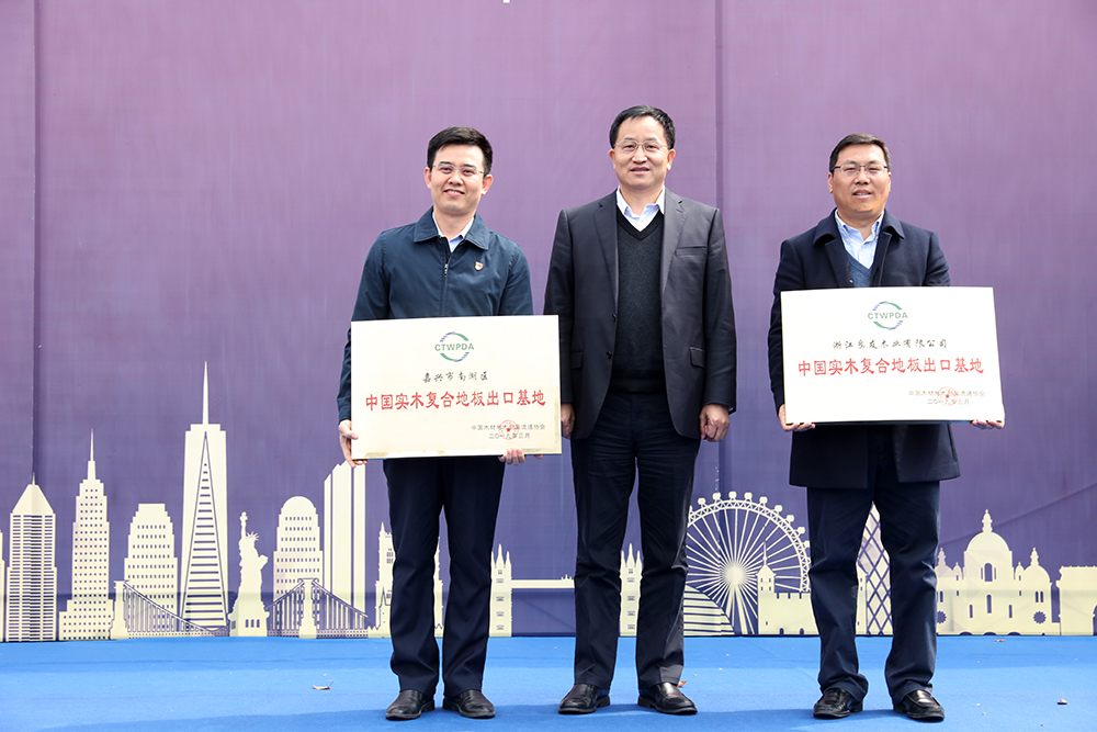 随后,嘉宾上台举行了隆重的授牌仪式。由中国木材与木制品流通协会会长刘能文先生,为嘉兴市南湖区政府及良友木业大艺树地板授予“中国实木复合地板出口基地“奖牌。