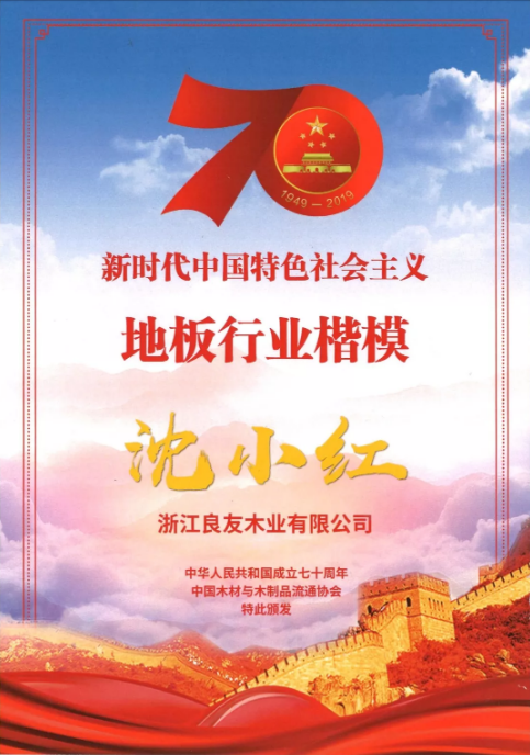 这离不开地板行业的楷模们,他们矜矜业业,扎实苦干;他们积极进取,勇于创新,用智慧与汗水谱写了新时代地板行业的新篇章。浙江良友木业董事长沈小红先生荣获了组委会颁发的"新时代中国特色社会主义地板行业楷模"荣誉称号。