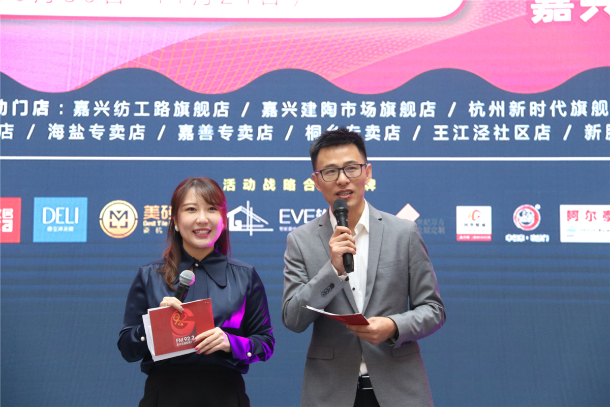 大艺树多年的合作伙伴:FM922知名主持人小江与鸽子为本次活动主持。代表大艺树向在场的消费者表示了诚挚的欢迎,并承诺本季地板节依然会为支持大艺树的消费者送上实实在在的回馈。
