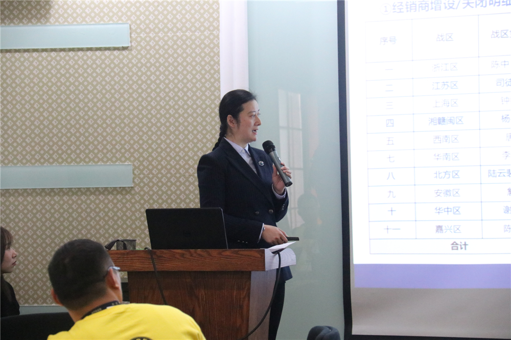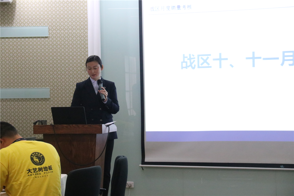 会议首先由大艺树地板副总经理陈庆女士对大艺树1-11月的销售业绩进行四维分析。通过数据的呈现与分析,能更直观地看到此前培训的成果,及规范化、专业化的促销活动对销售的强大推动力。