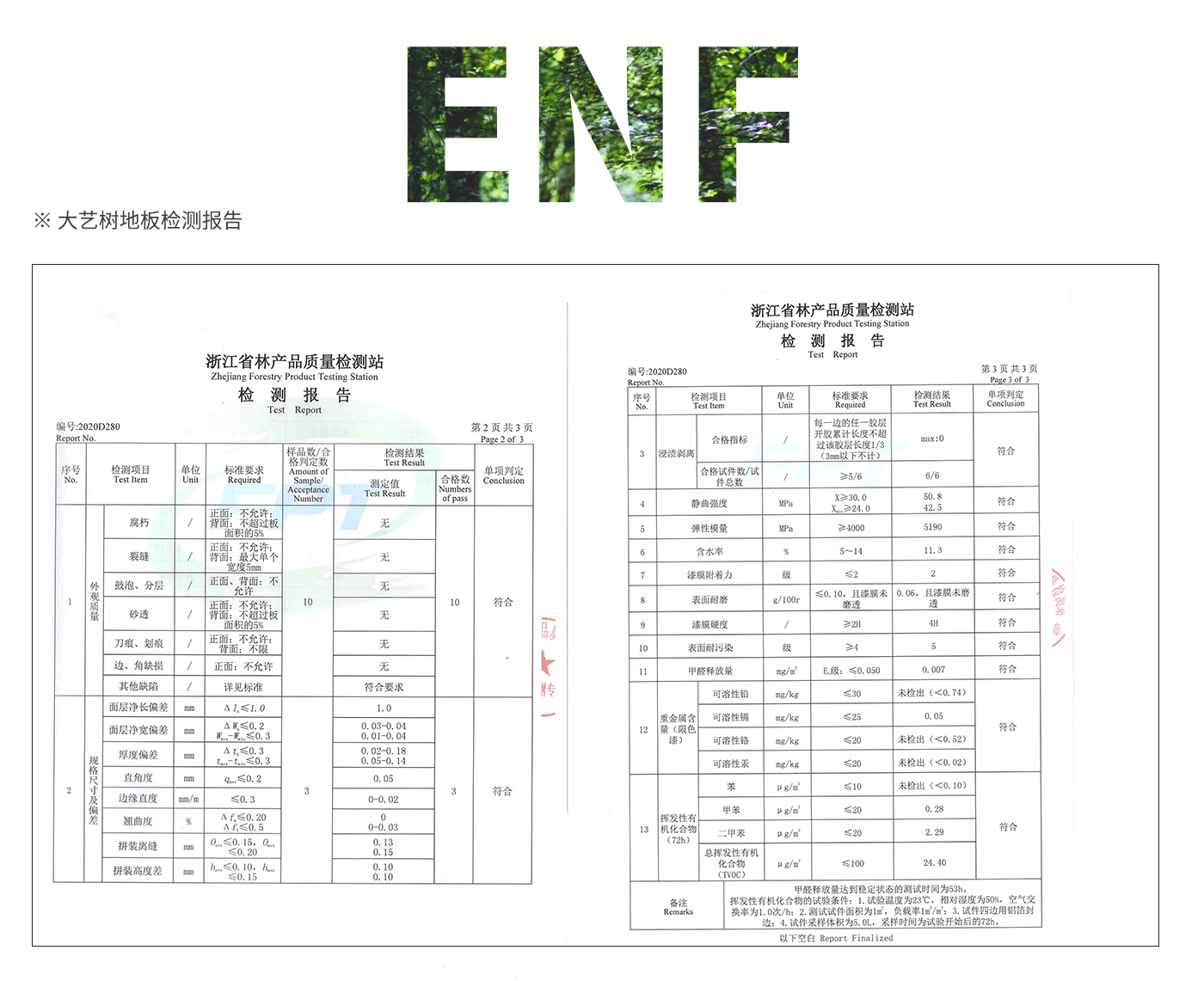 大艺树地板最新检测报告显示,甲醛释放量数据优于新国标ENF指标,成为首批达到ENF等级的地板品牌——正式迈入无醛级新时代。大艺树地板自成立以来持续为消费者创建环保健康的家居环境,把产品质量放首位,从原料生产加工到成品检测出厂,每一个环节都力求完美,更是将环保融进产品DNA里,致力打造绿色地板。