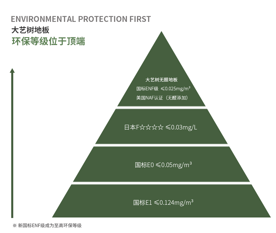 随着健康环保理念的深入,“无醛”概念应运而生,打造无醛家居环境,不仅仅是地板行业追求的目标,更是消费者的心之所向。引领家具建材行业大变革的《人造板及其制品甲醛释放量分级》(GB/T 39600-2021)及《基于极限甲醛释放量的人造板室内承载限量指南》(GB/T 39598-2021)于2021年10月1日正式实施,新国标ENF级成为至高环保等级,让无醛有了新依据。