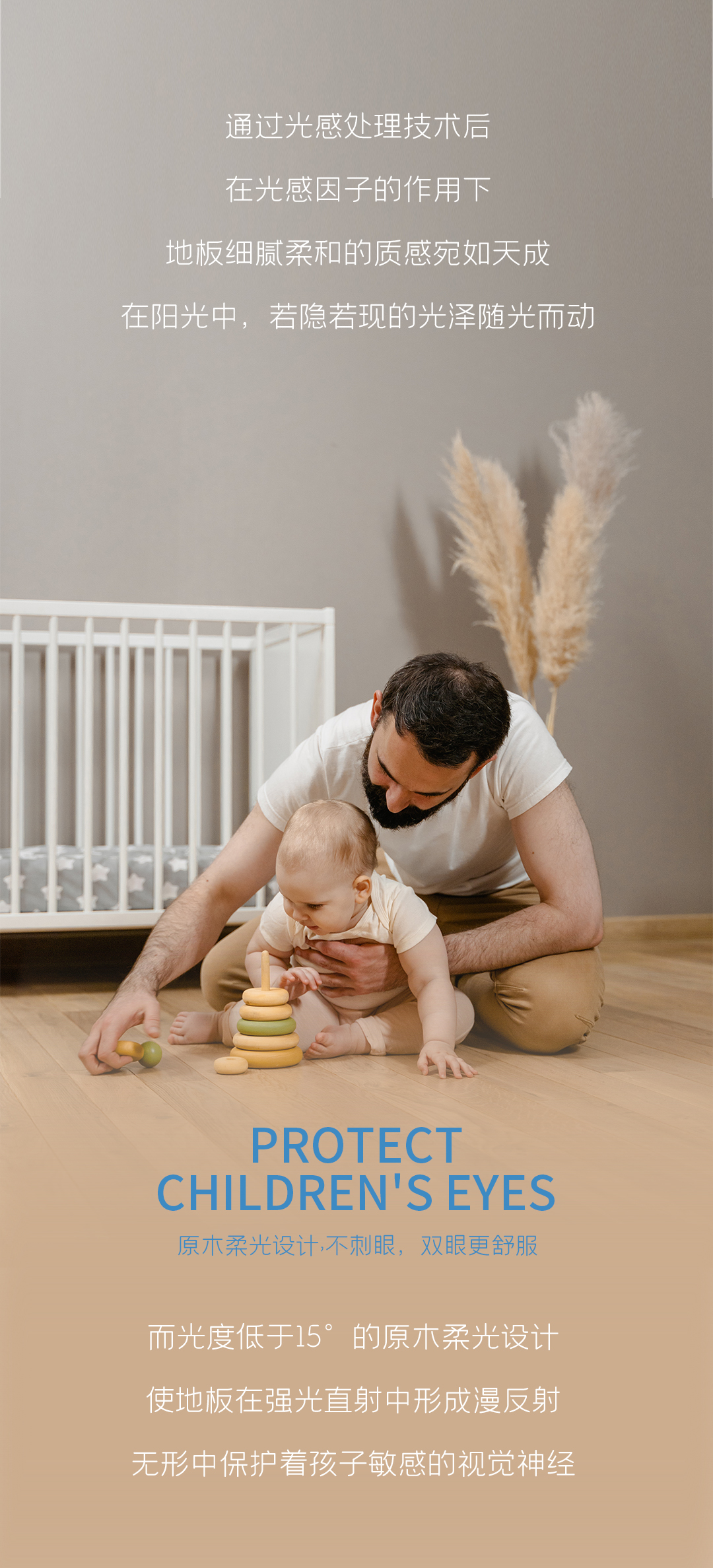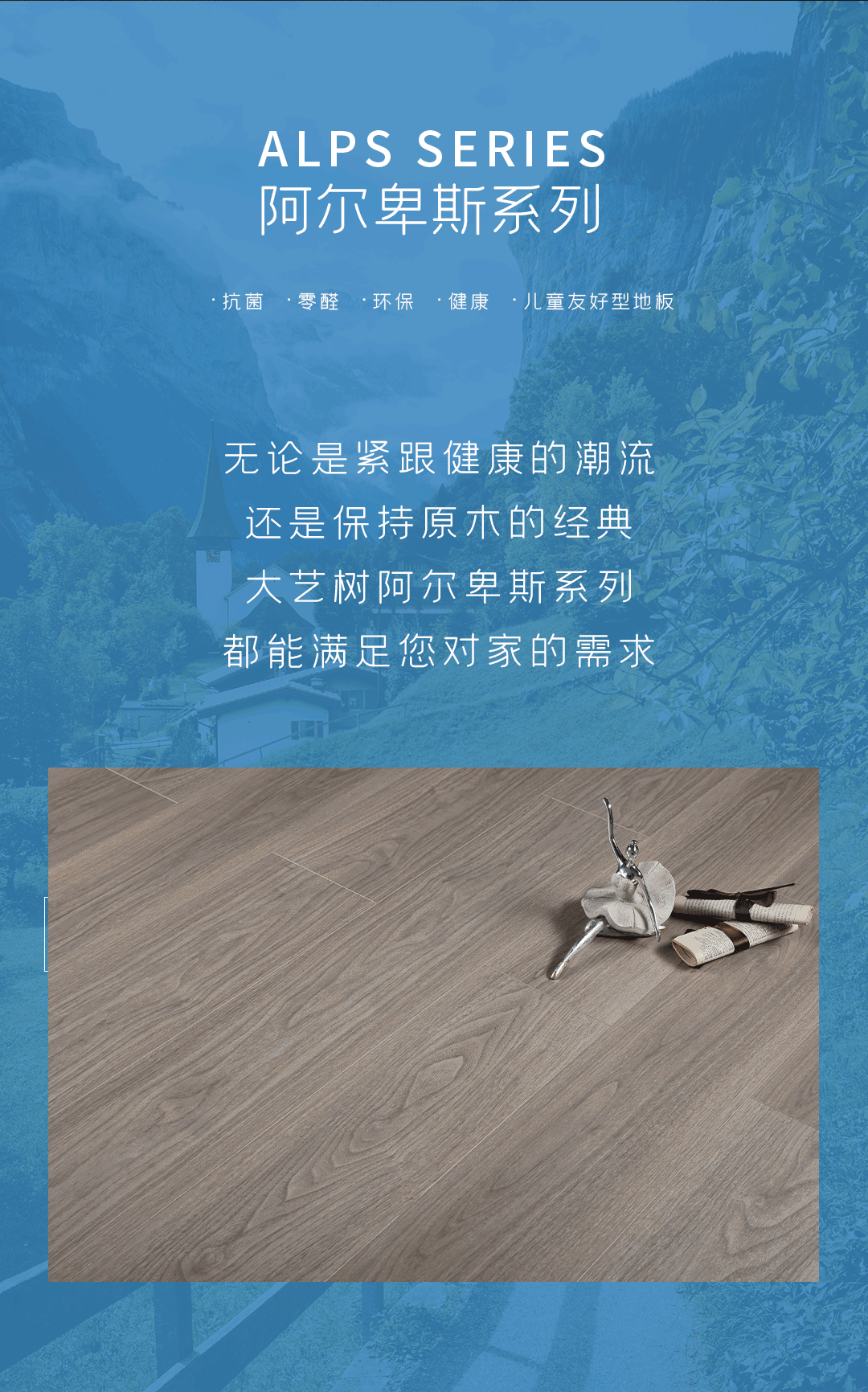 以阿尔卑斯山灵秀的风光与纯净为设计灵感,将其秀美的风光融入地板延绵的纹理里。零醛质造和抗菌技术的加持,有效杀灭地面上及空气中的细菌与病菌,让你在家也能呼吸到如同阿尔卑斯山一样纯净健康的好空气,足不出门,静享健康新生活。