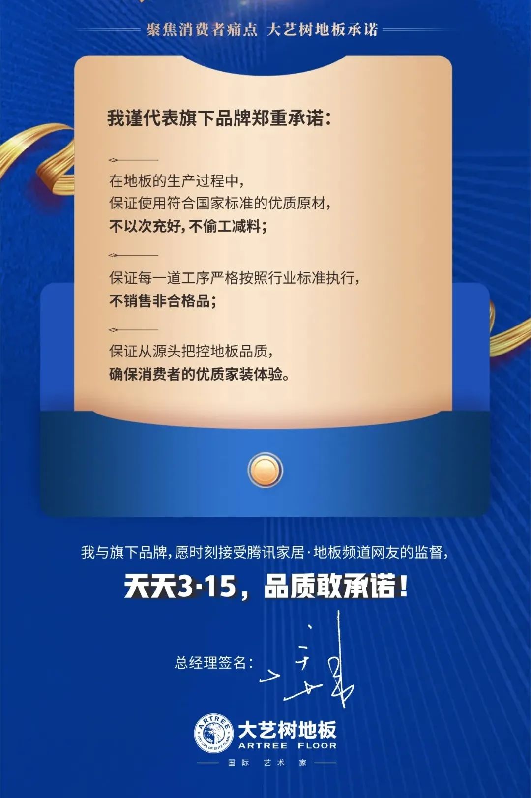 3月初,大艺树地板凭借优质的综合服务能力揽获“年度家居行业服务品牌”荣誉,成为行业优秀标杆,在315(国际消费者权益日)联合腾讯家居及24家知名地板品牌硬气发声:共同承诺,从源头把控地板品质不以次充好,不偷工减料不销售非合格品,确保消费者优质家装体验。