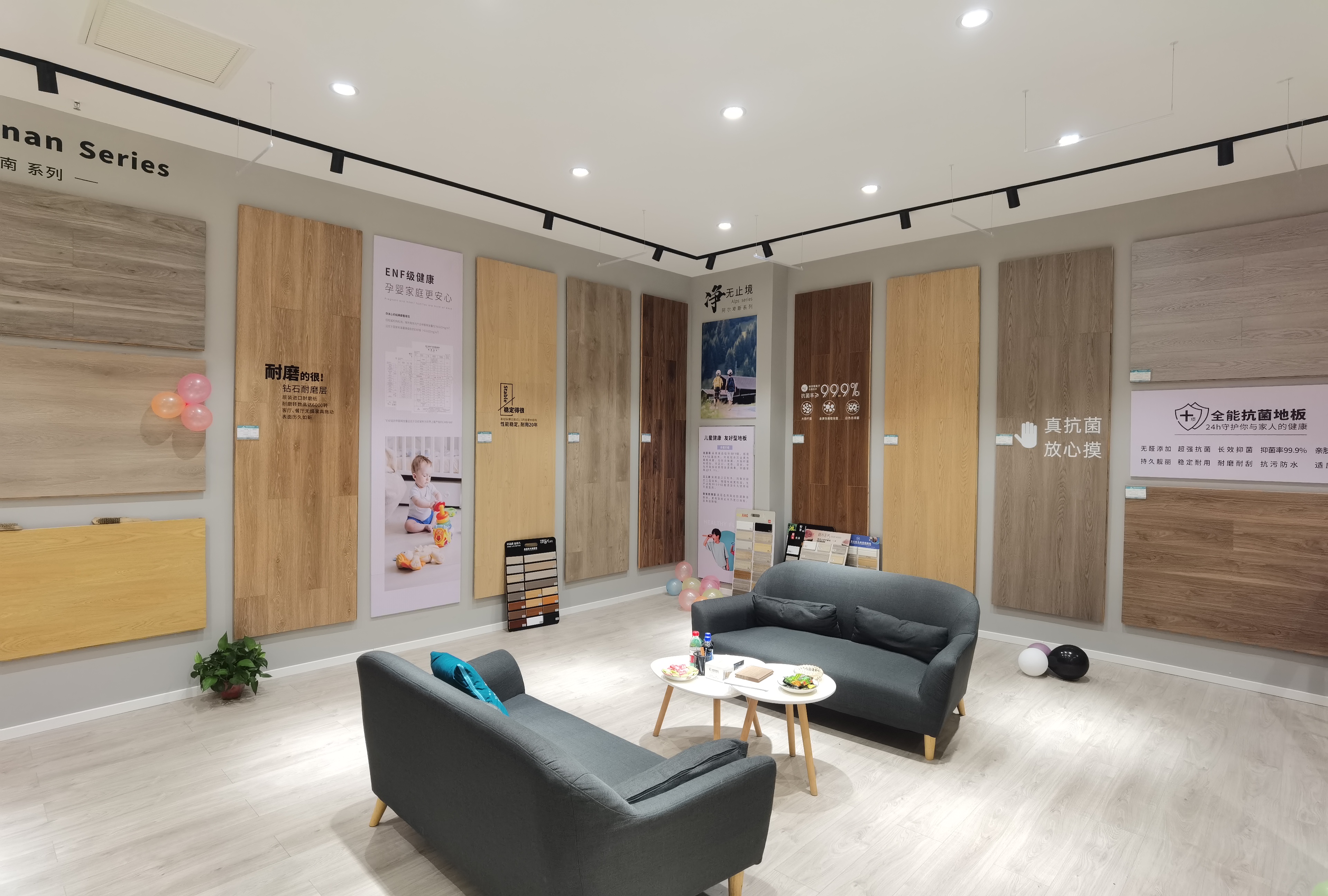 大艺树九江店按总部5.0终端方案装修,总面积183m²左右,产品以高性价比的库利南系列为主,儿童友好型地板阿尔卑斯系列及高端定制款地板为辅,展示地板产品大样100多款。