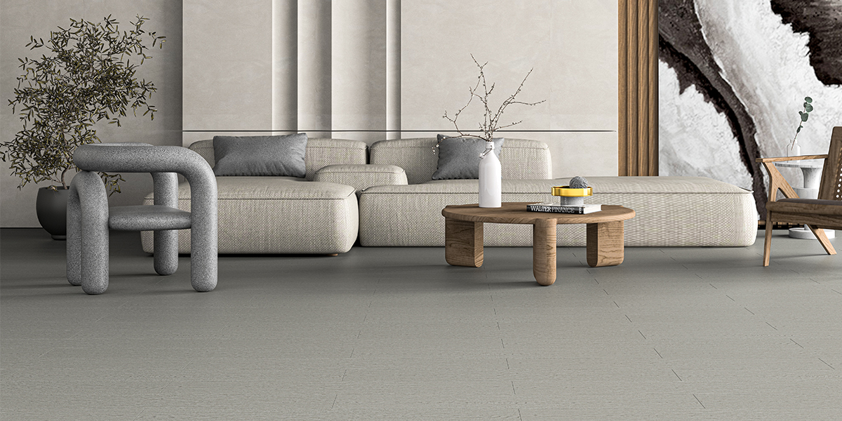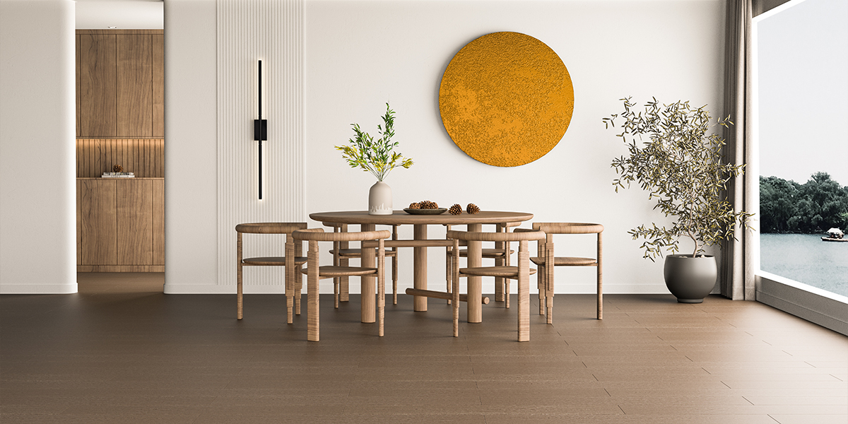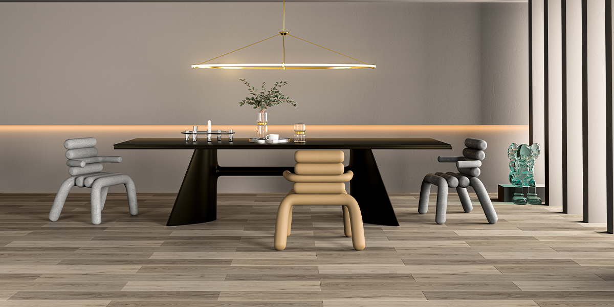 地板采用淡雅灰、原木黄、大地棕等低饱和度色系,窗外的光反射到地板上,树影斑驳,光色迷离,产生一种时光流转之美,也让空间氛围显得更为灵动轻盈。