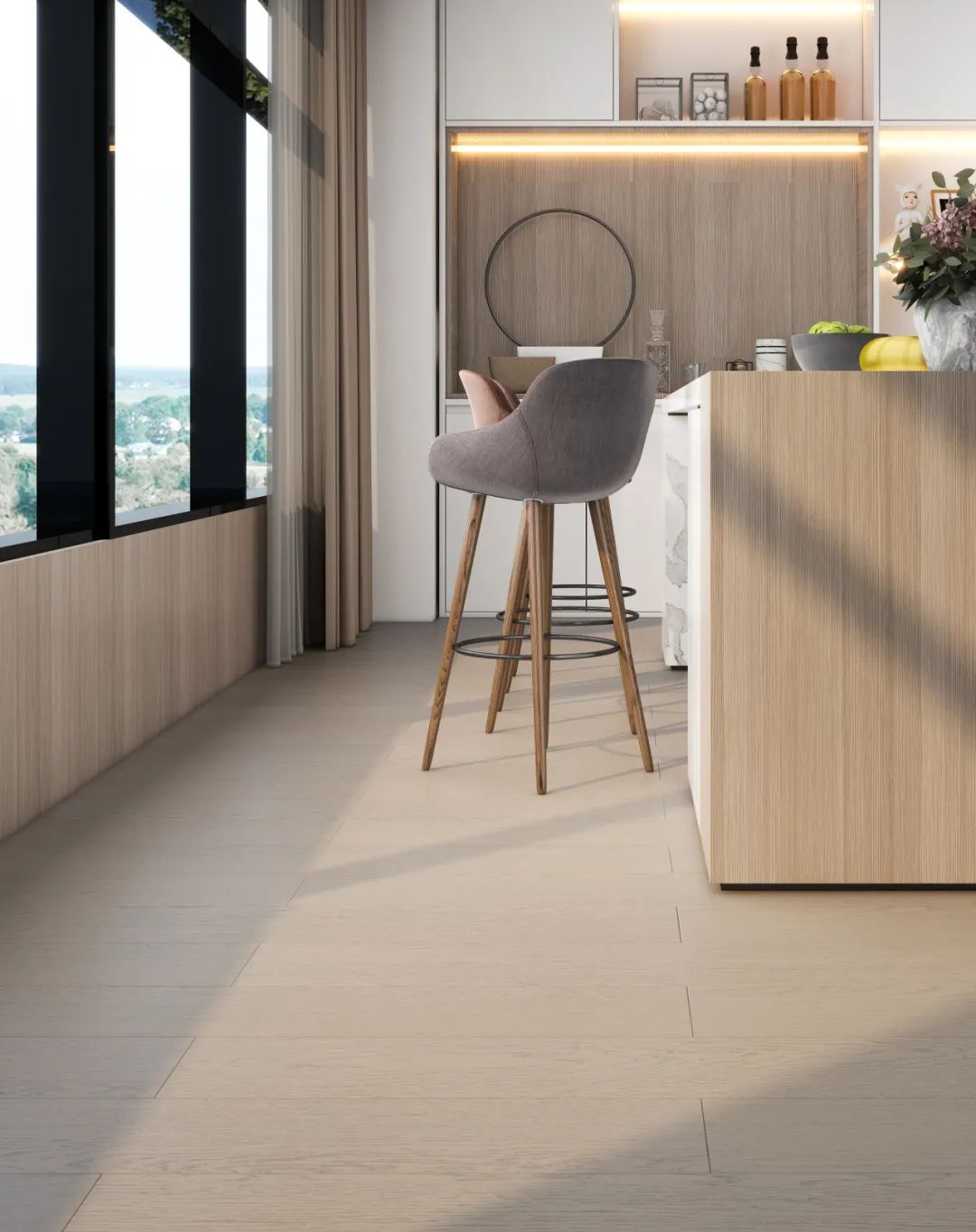 地板以东方传统色素采命名,以A级橡木木皮为创作基础,天然与优选相结合,原木细微的色彩变化被保留,铺叙出温暖的质感,自然美色叙述的高级感洒落在空间每一个角落。
