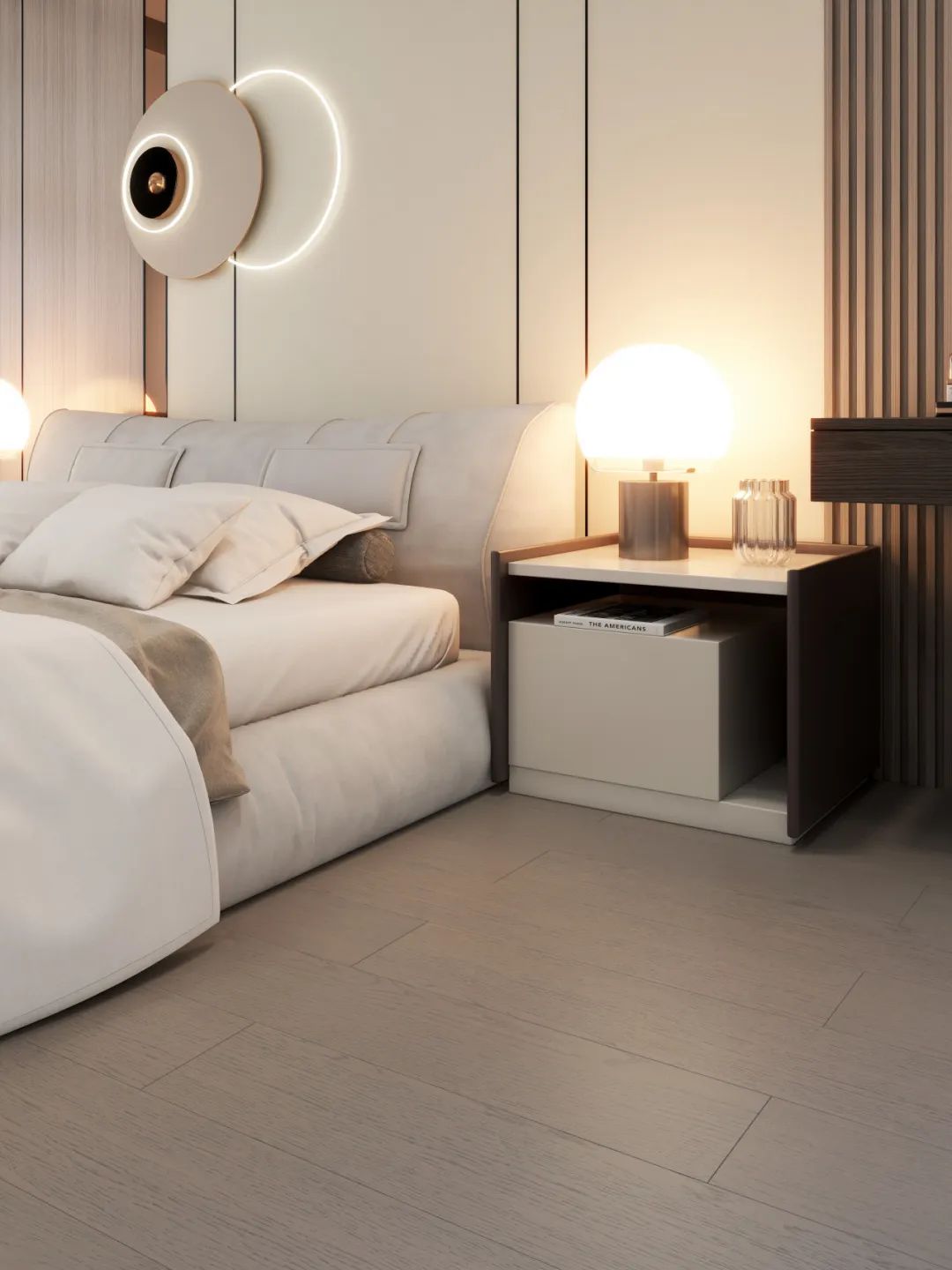 所有的织物透着纯净、温和,地板与之互为呼应,虚实相生,空间细节将视觉定格,地板纹理、织物肌理、自然微光,使得空间丰富多彩,轻奢又精致。
