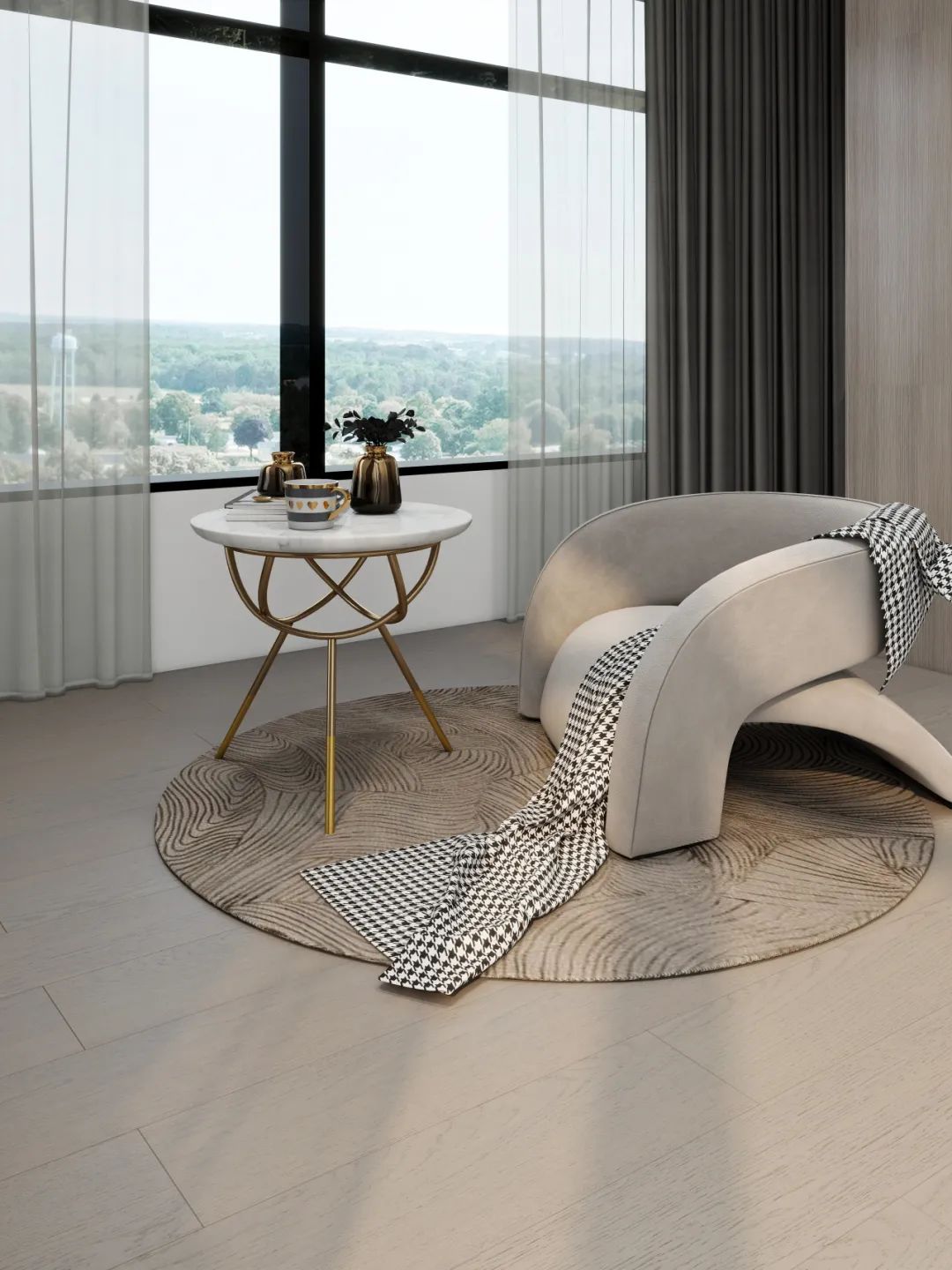 地板与软装的巧妙搭配也让家居空间焕发出简而奢的光彩。柔软的沙发,个性的地毯,轻薄的窗纱...