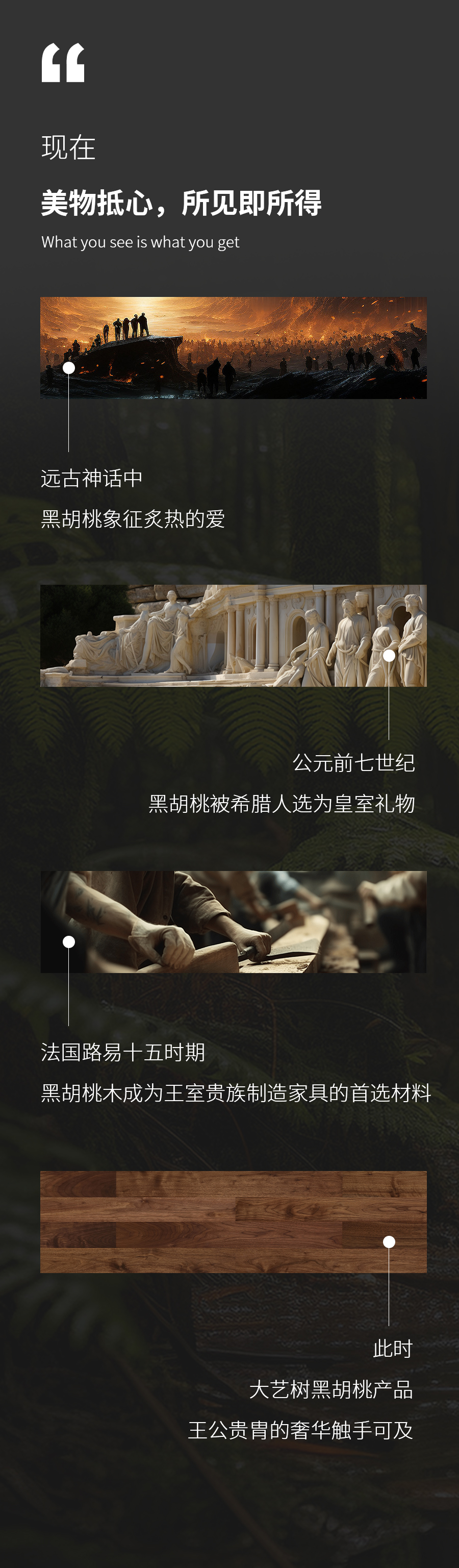 黑胡桃在空间中营造出的自然而宁静的氛围,仿佛将大自然的美妙带进了室内。它不仅仅拥有美丽的外貌,内在实力更是硬核,它的生长环境造就了它坚硬耐磨的特点,因其强度坚韧能够抵御日常磨损和划痕,深受青睐,直到现在仍是居住者十分钟情的三大家居材料之一。